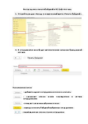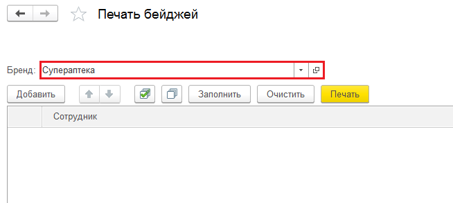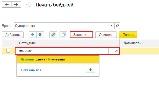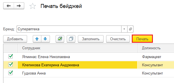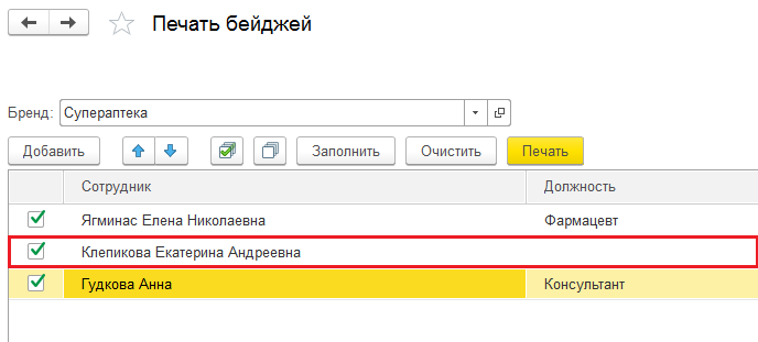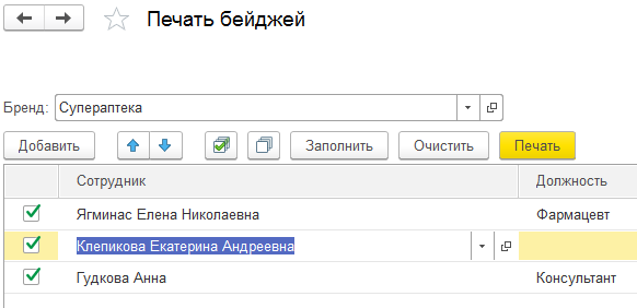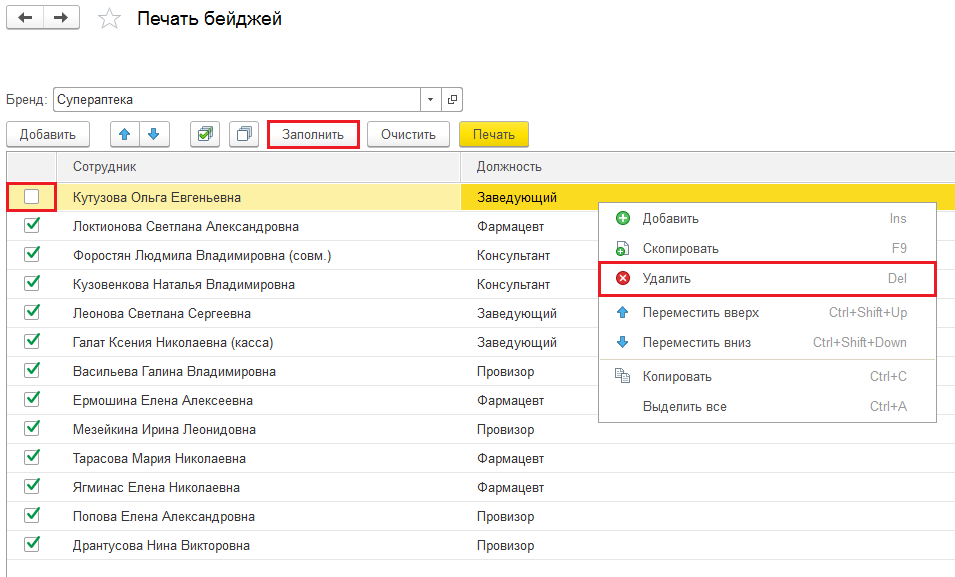 -Для заполнения списка всеми сотрудниками, числящимися в аптеке, нажмите кнопку «Заполнить». Если печать бейджа не требуется по какому-либо сотруднику из списка можно: