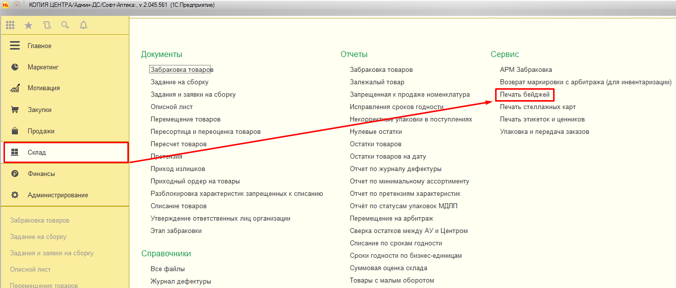 Откройте раздел «Склад» и в сервисе выберите «Печать бейджей».