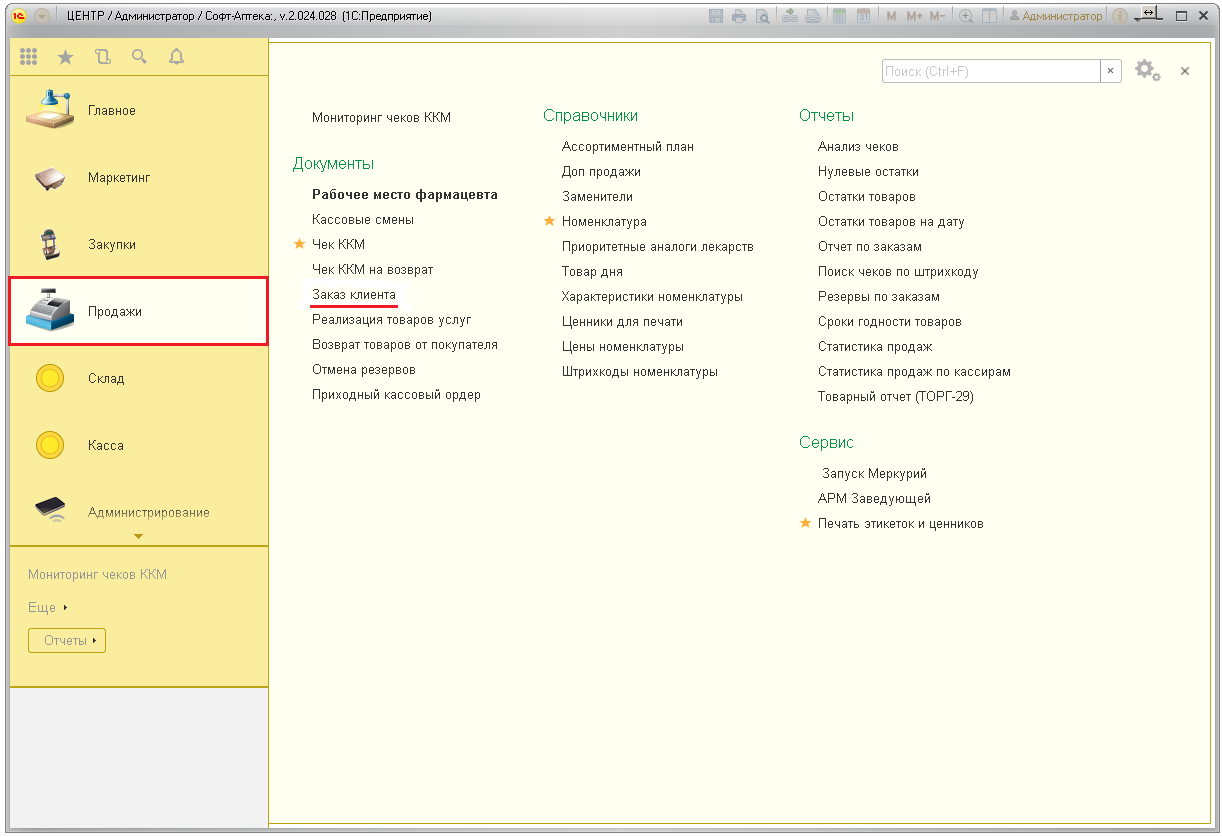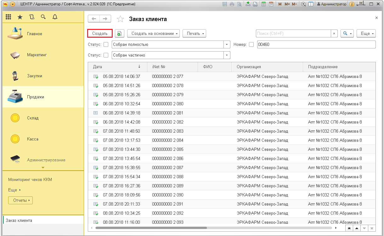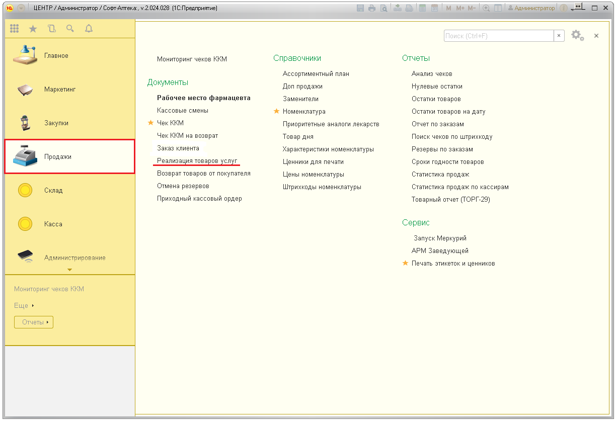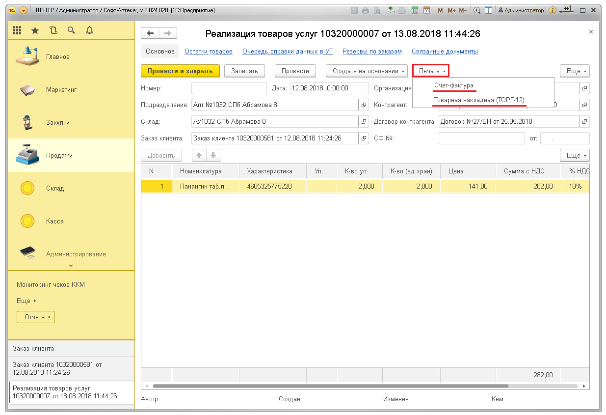 Документ реализации создаётся в Софт-Аптеке на основании заказа.