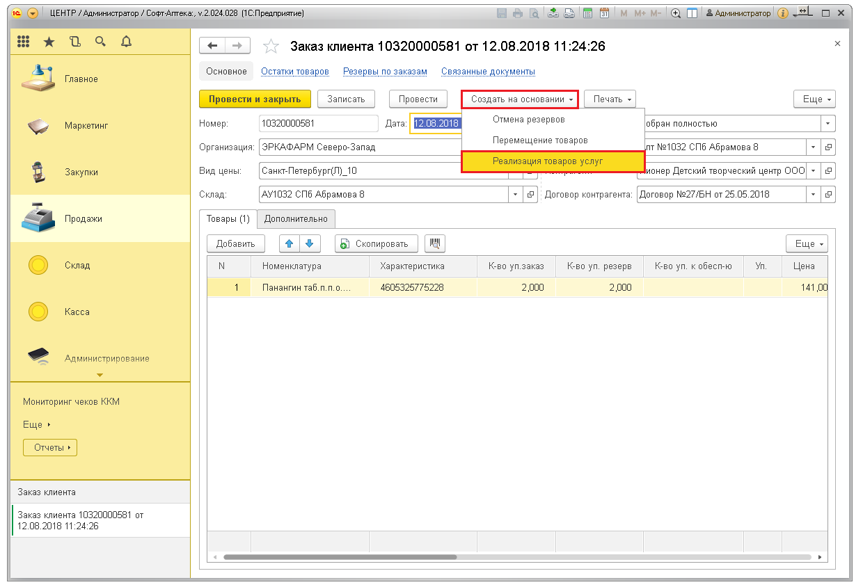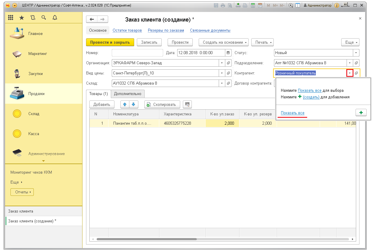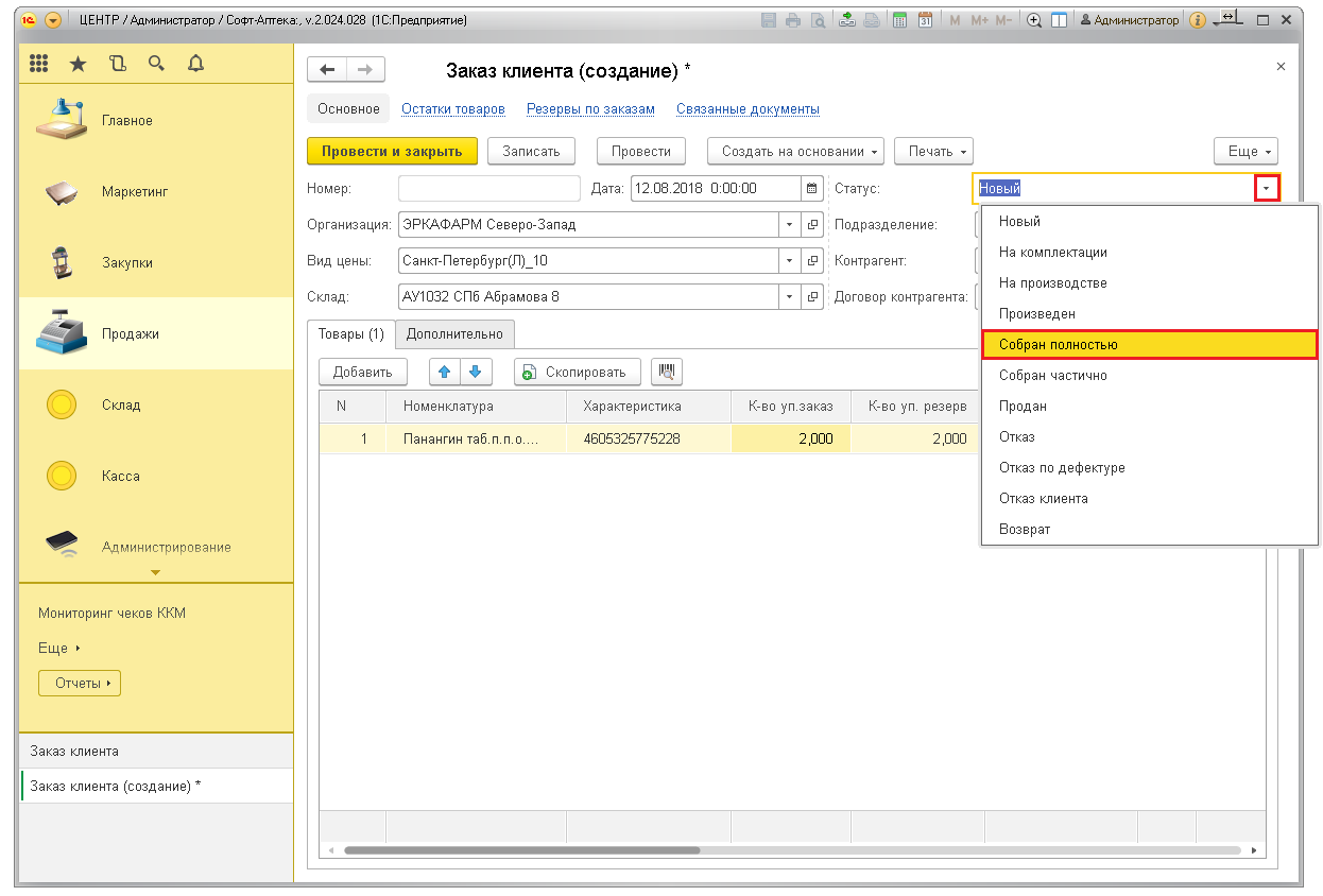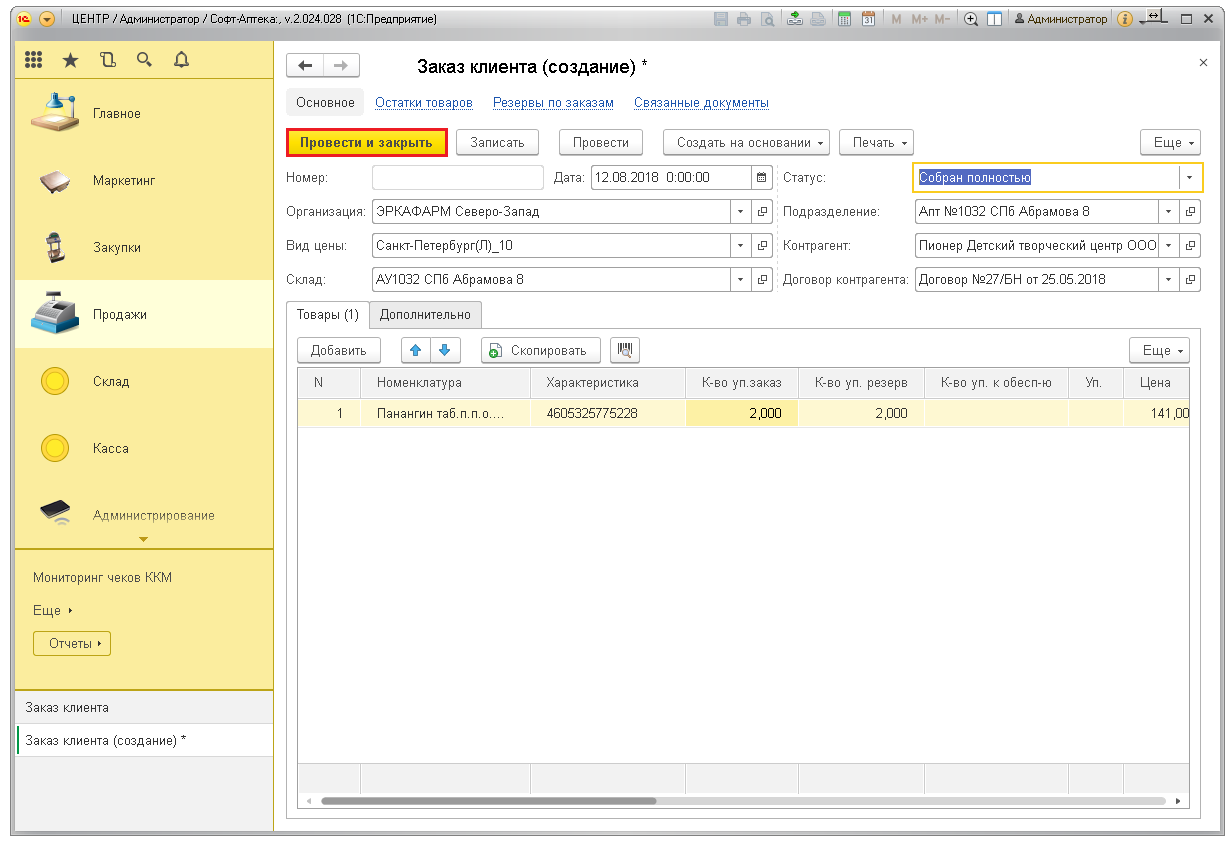 Для подтверждения заказа нажмите кнопку «Провести и закрыть». Товары уйдут в резерв и будут числиться на остатках в аптеке.