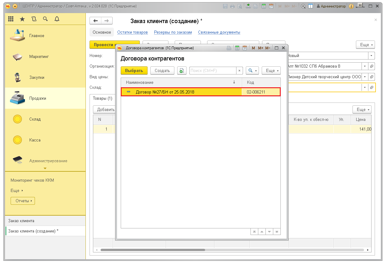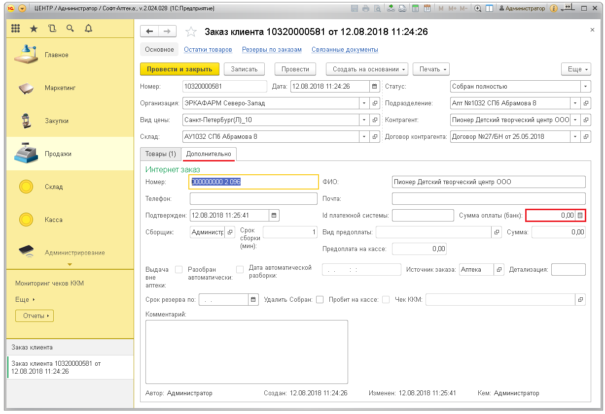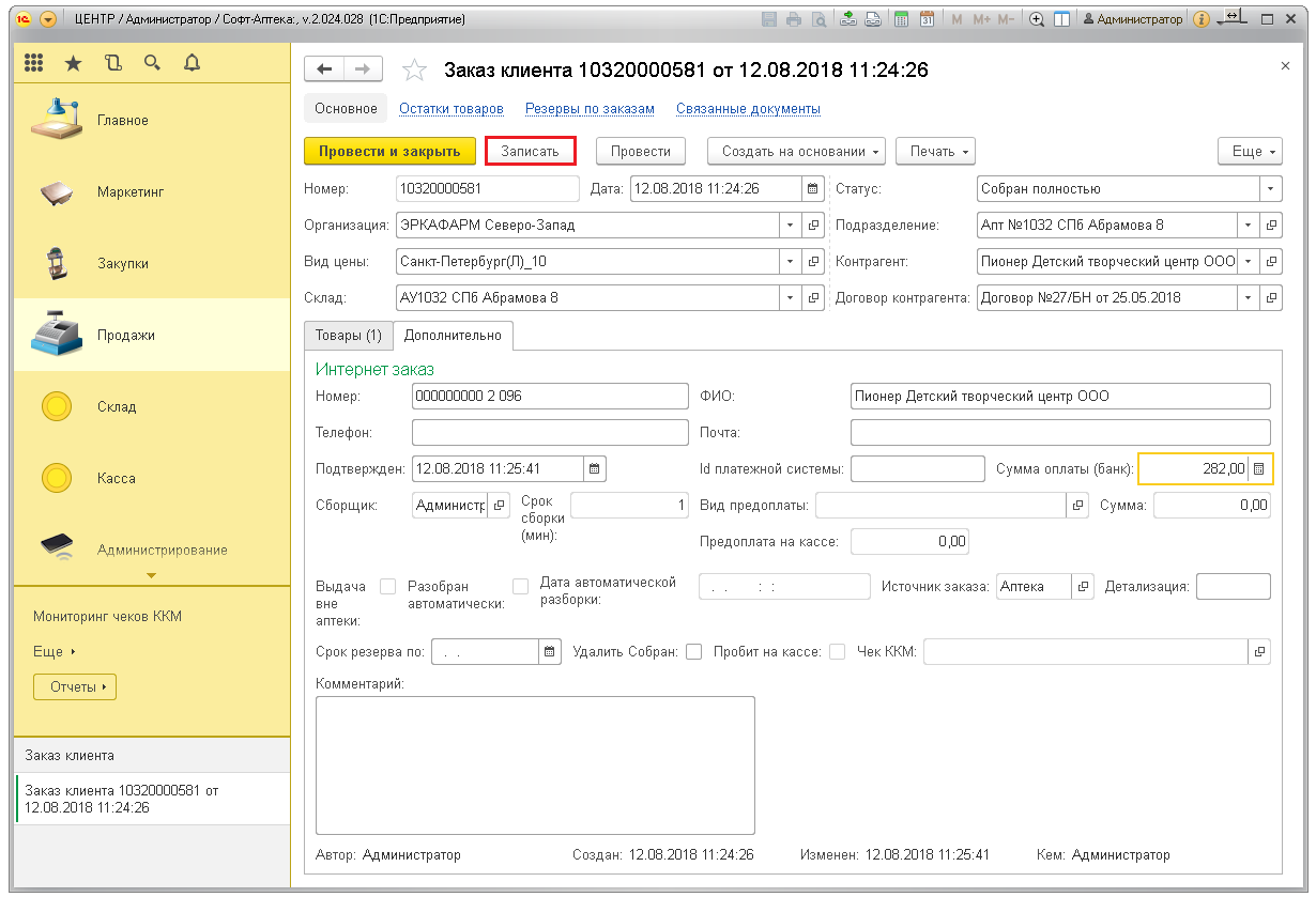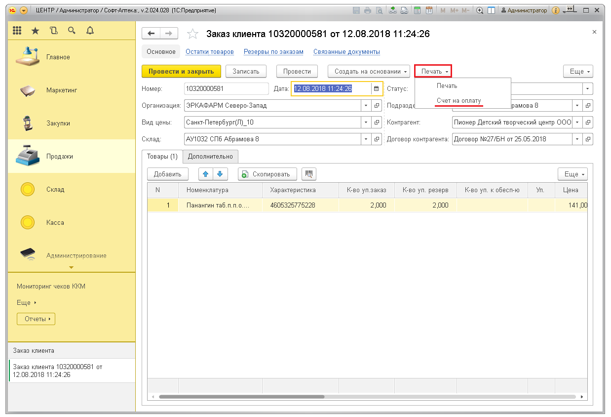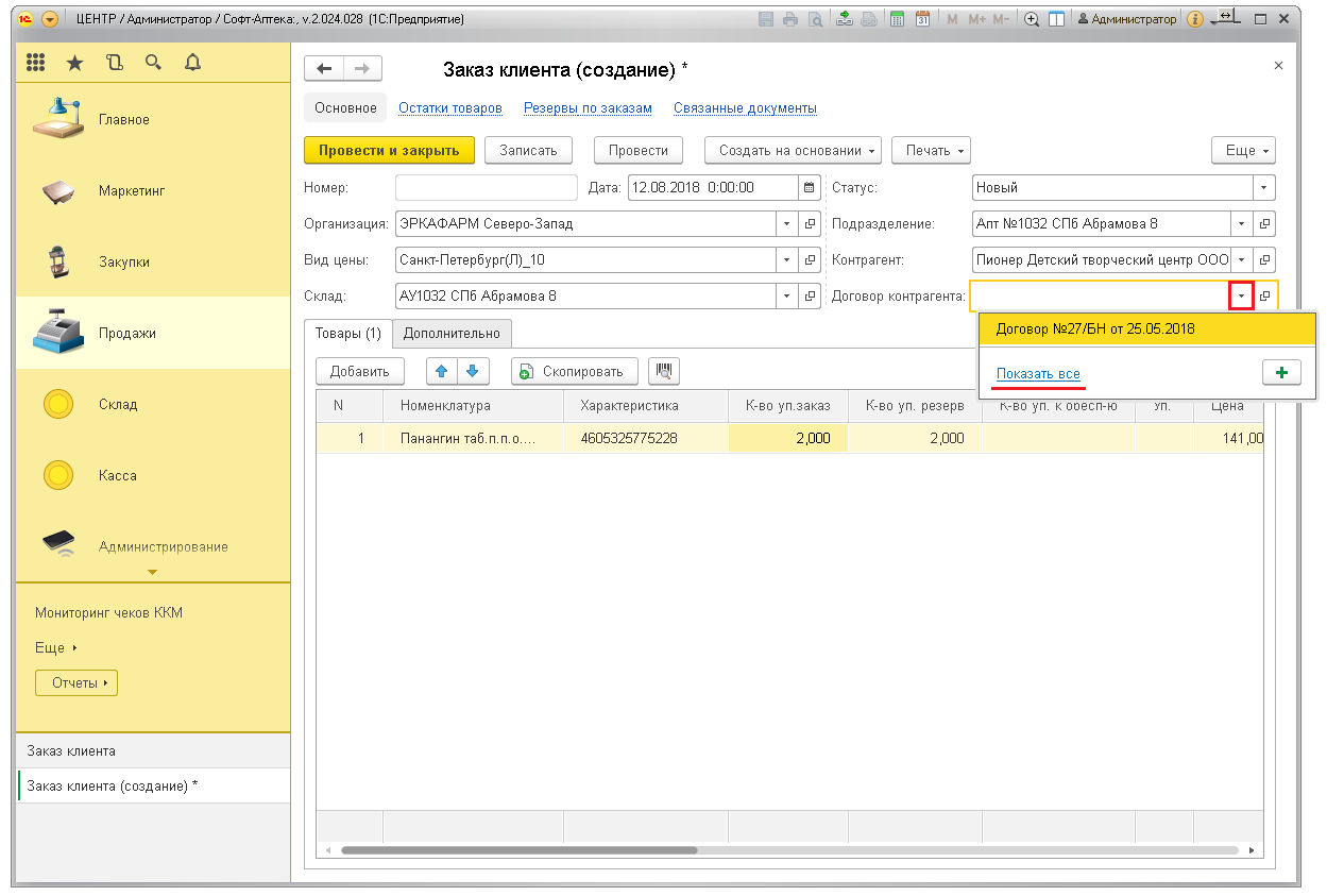 Для подтверждения заказа нажмите кнопку «Провести и закрыть». Товары уйдут в резерв и будут числиться на остатках в аптеке.