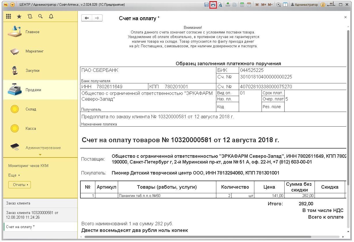 Отправьте счёт на печать, нажав на значок принтера. Заверьте счёт подписью и печатью аптеки.