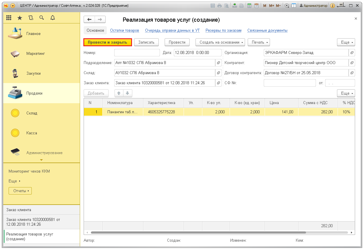 Для проведения реализации нажмите кнопку «Провести и Закрыть». Товары снимутся с резерва и спишутся с остатков аптеки.