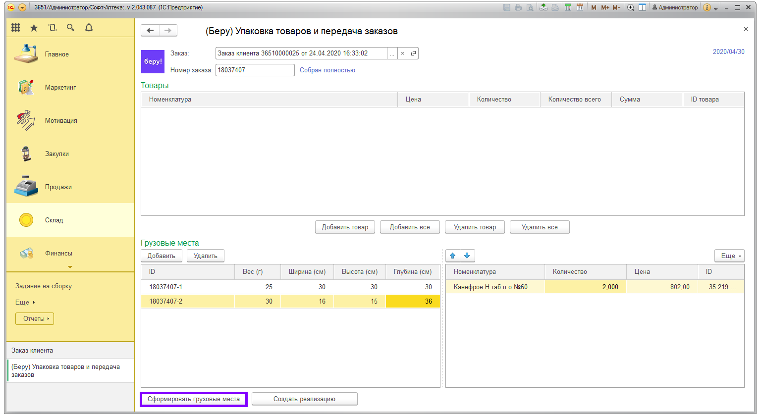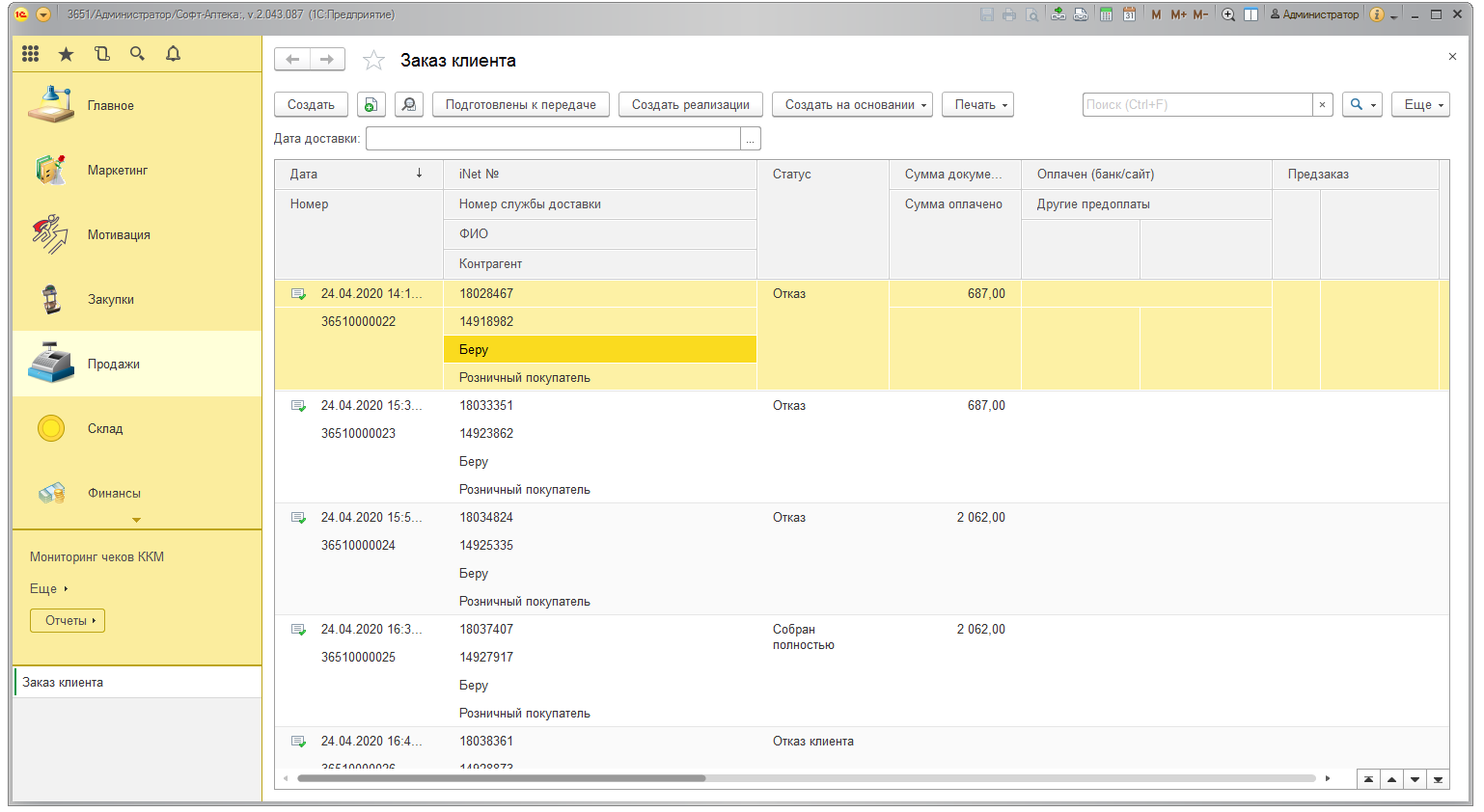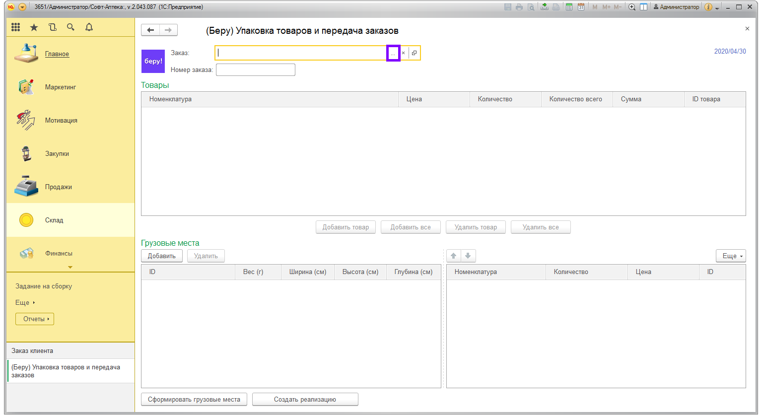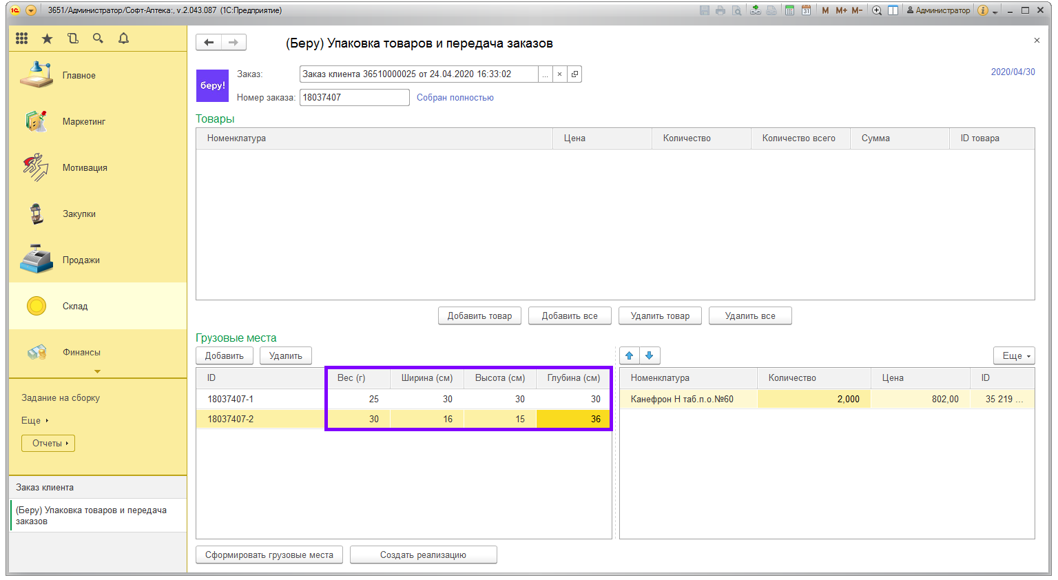 Сборка заказов на доставку службой Беру в ИС Софт-Аптека