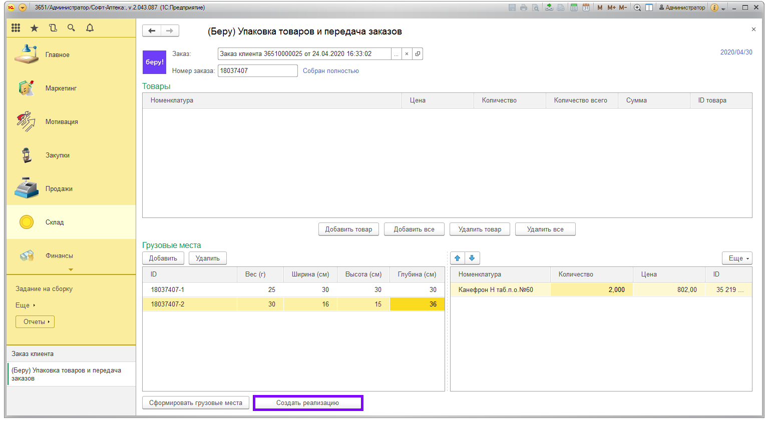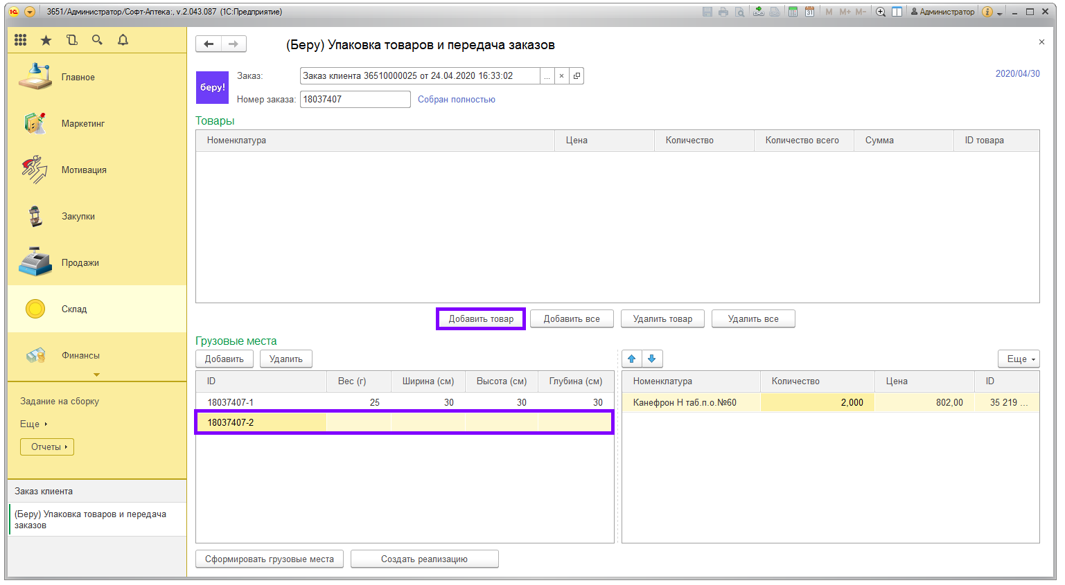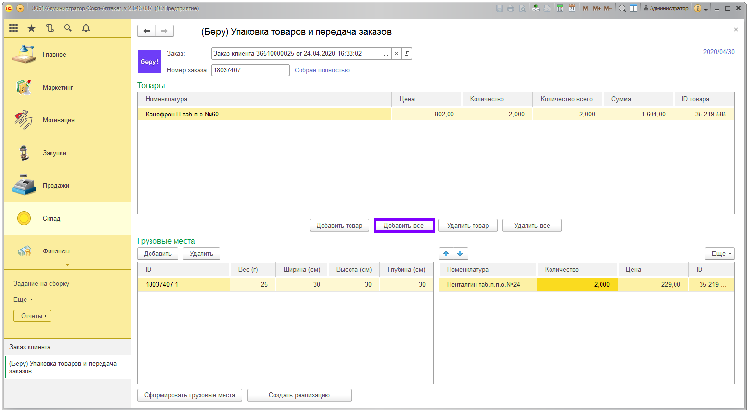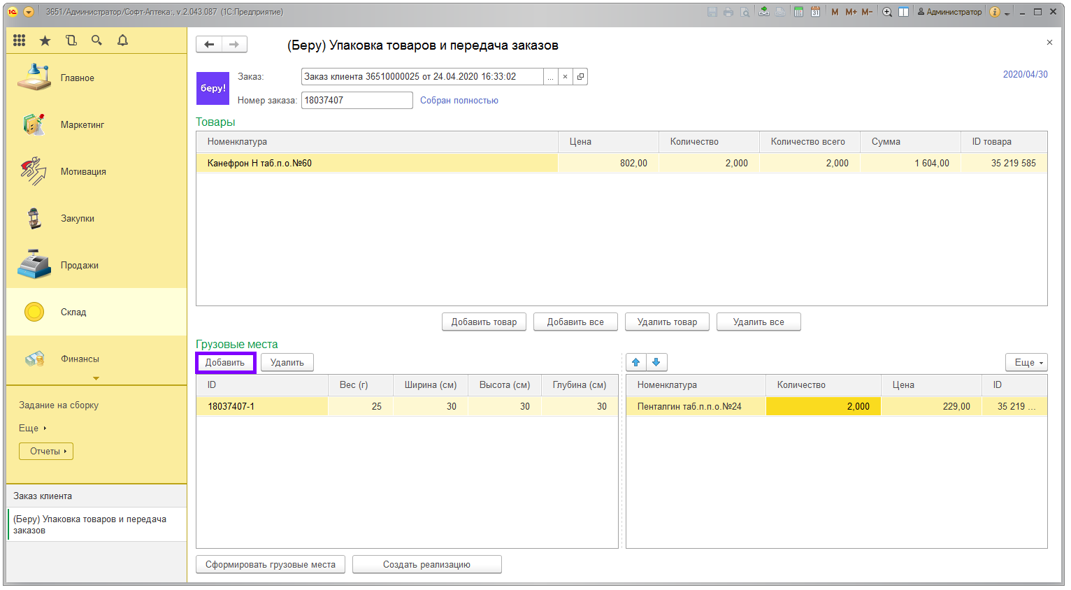 Сборка заказов на доставку службой Беру в ИС Софт-Аптека